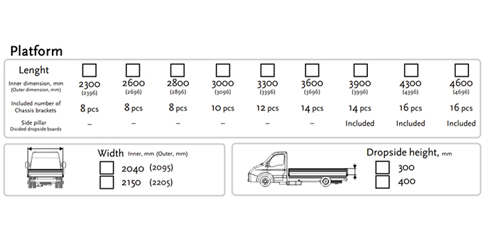När du beställer ett nytt Armaton Modular Platform Kit har du flera olika alternativ på längd, bredd och höjd att välja på, vilket gör att du enkelt kan anpassa dimensionen på flaket efter dina behov.